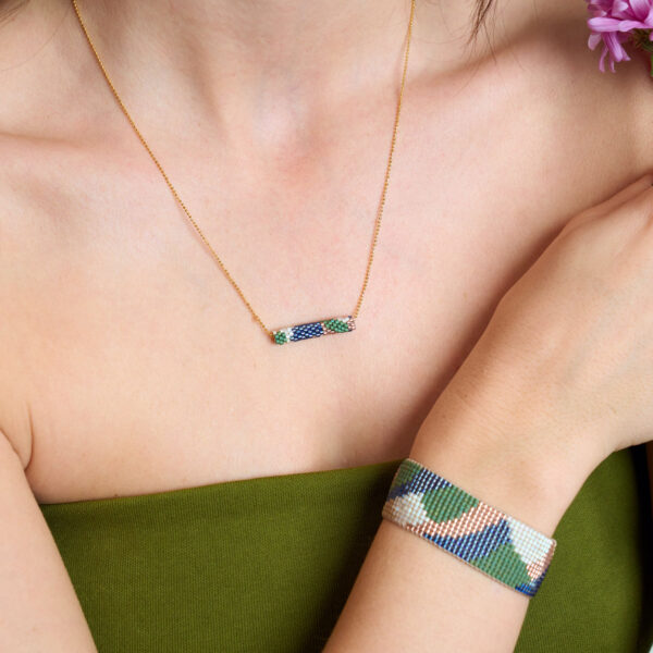 Küpe halkaları, kancaları ve kolye zincirleri 925 ayar gümüş üzeri 18 ayar altın kaplamadır. Bileklik kilit bölümleri ise pirinç üzeri 18 ayar altın kaplamadır. Örme ürünlerde ise cam boncuklar kullanılmaktadır. Takılarımızda kullandığımız materyallerin hiçbiri sağlığa zararlı olduğu bilinen “nikel” içermemektedir.